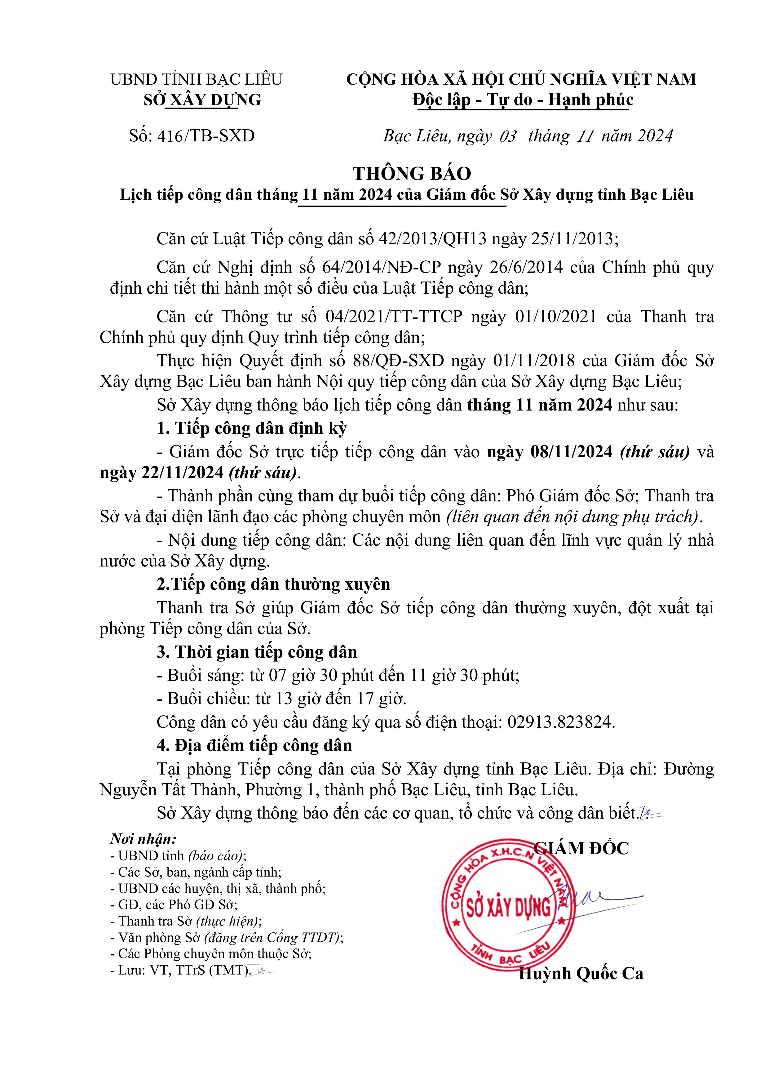 Thông báo lịch tiếp công dân tháng 11 năm 2024 của Giám đốc Sở Xây dựng tỉnh Bạc Liêu - sxd