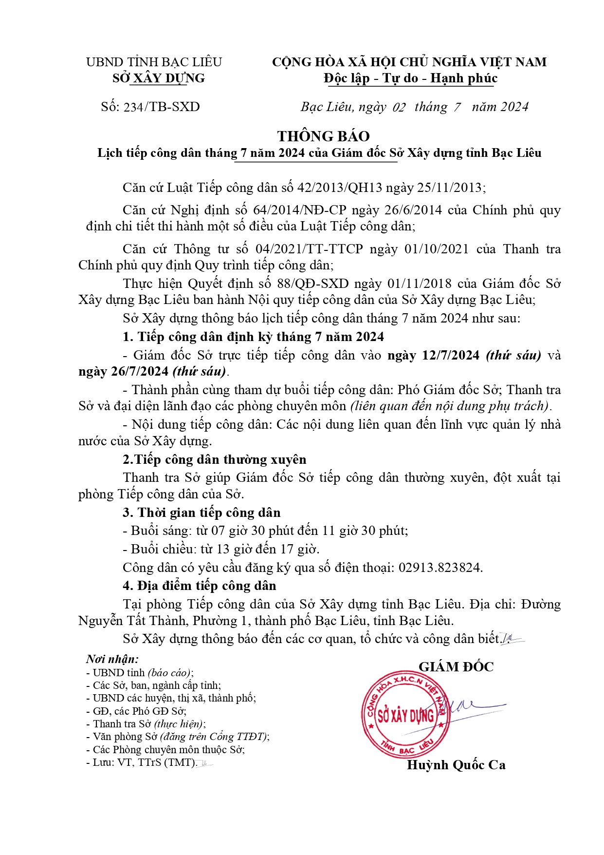 null Thông báo lịch tiếp công dân tháng 7 năm 2024 của Giám đốc Sở Xây dựng tỉnh Bạc Liêu