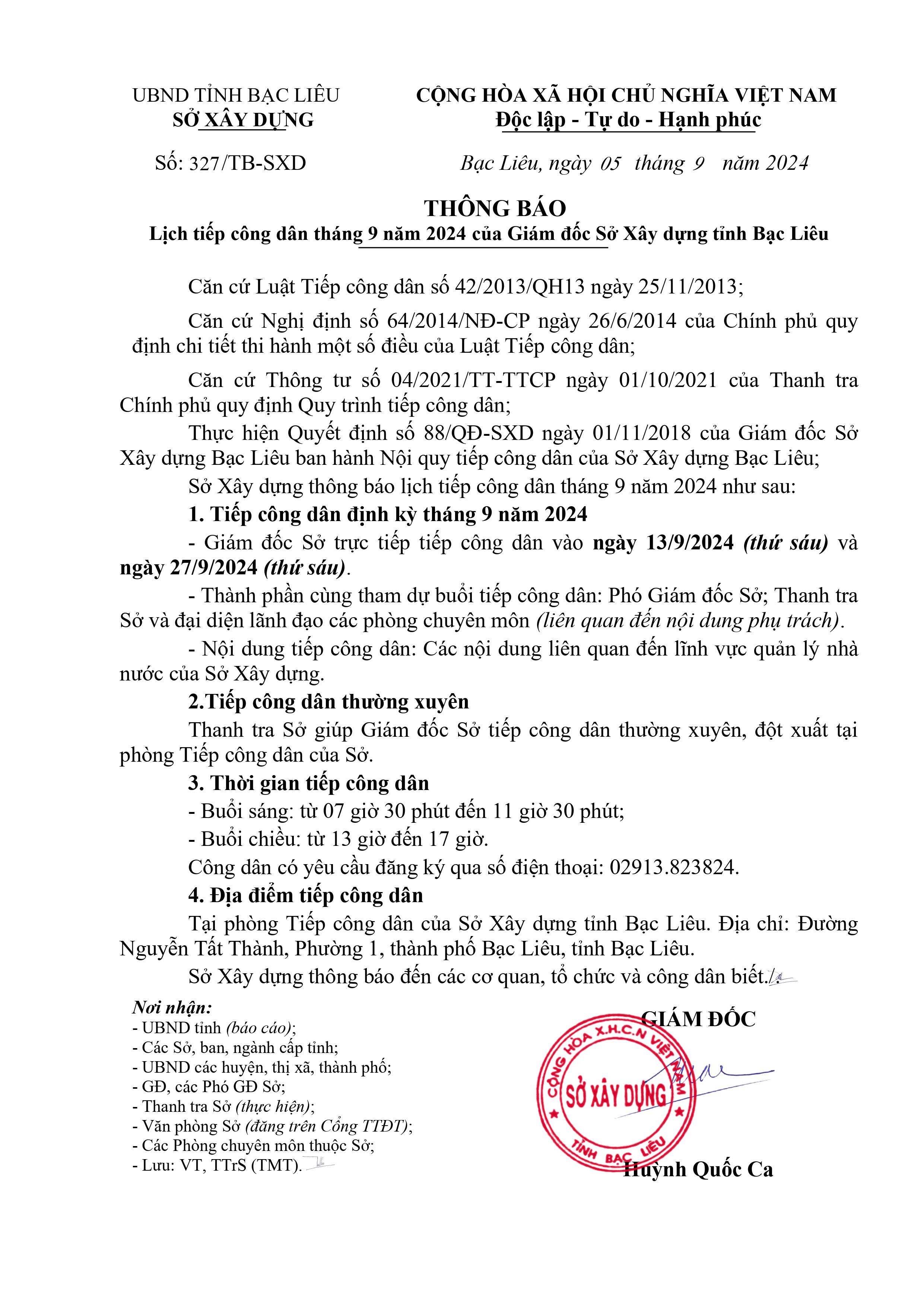 Thông báo lịch tiếp công dân tháng 9 năm 2024 của Giám đốc Sở Xây dựng tỉnh Bạc Liêu - sxd