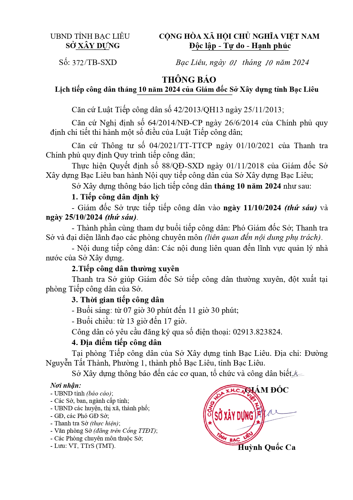 Thông báo tiếp công dân tháng 10 năm 2024 - sxd